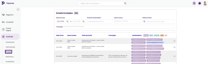 Ao acessar Controles > E-mails, você verá uma lista completa de todos os e-mails enviados pela sua imobiliária.