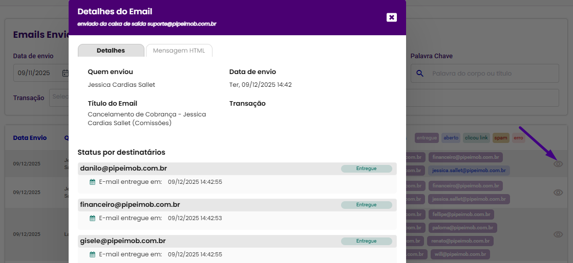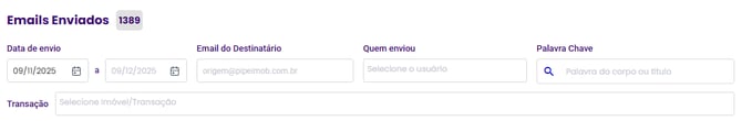 A tela de E-mails do Pipeimob centraliza todas as mensagens enviadas pela sua agência e facilita o acompanhamento do histórico de comunicação. Com filtros avançados e visualização detalhada por destinatário, você ganha mais controle e transparência sobre tudo o que foi disparado pelo sistema.