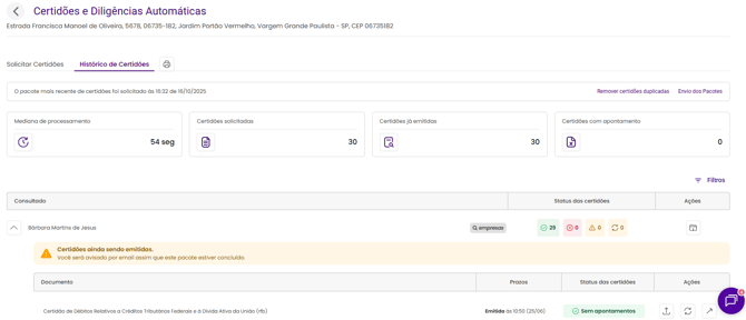 Utilize o Histórico de Certidões para visualizar o andamento, reemitir documentos e resolver rapidamente eventuais falhas na emissão.