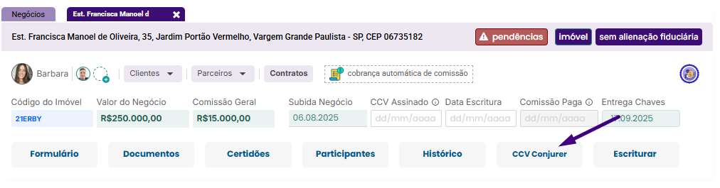 Para acessar o gerador de contrato, clique no botão "CCV Conjurer" dentro do negócio.