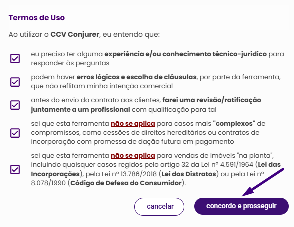 Antes de seguir, será necessário aceitar os termos de uso e limitações da ferramenta.