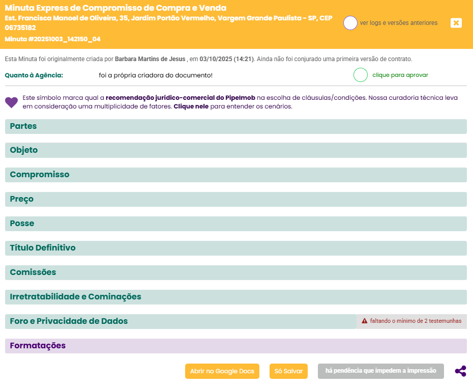 Essas cláusulas dão corpo à minuta, mas todo o texto é editável, permitindo ajustes personalizados conforme a necessidade da negociação. A emissão da minuta acontece ao final do processo, por meio da opção "Conjurar", disponível após a resolução de todas as pendências da minuta.