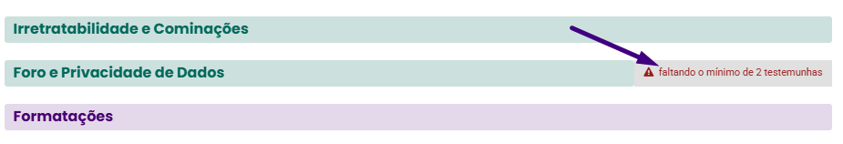 Para gerar o PDF final do contrato, todas as pendências devem estar resolvidas. Pendências aparecem em vermelho ao lado do nome do capítulo e indicam problemas como:
