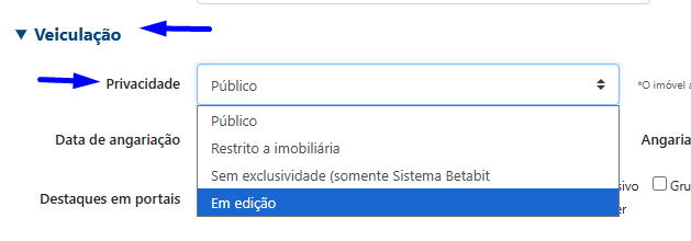Dentro da ficha do imóvel, localize a seção "Veiculação". No campo "Privacidade", você poderá selecionar o status desejado no menu suspenso para avançar o imóvel no ciclo de vendas.