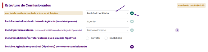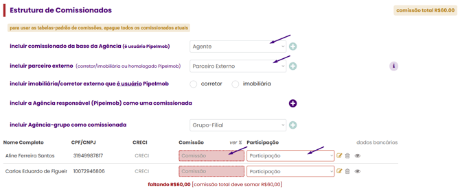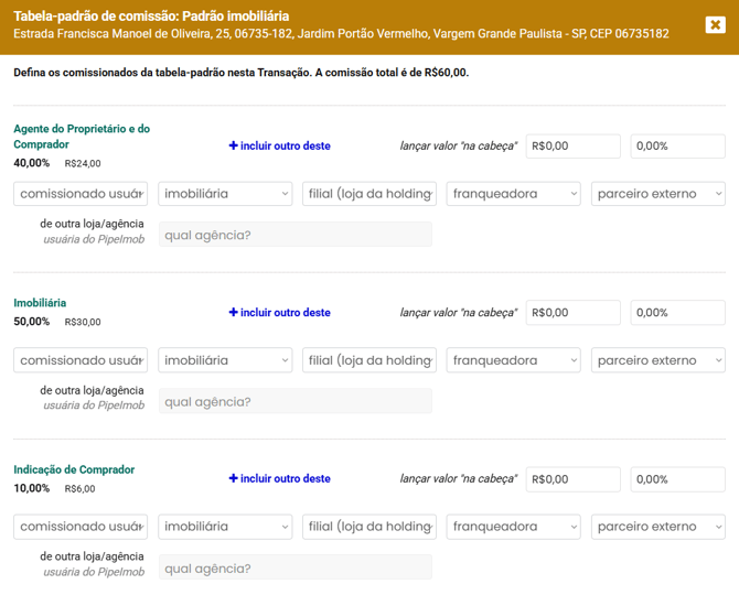 Caso sua imobiliária não utilize tabelas-padrão, adicione os comissionados manualmente: