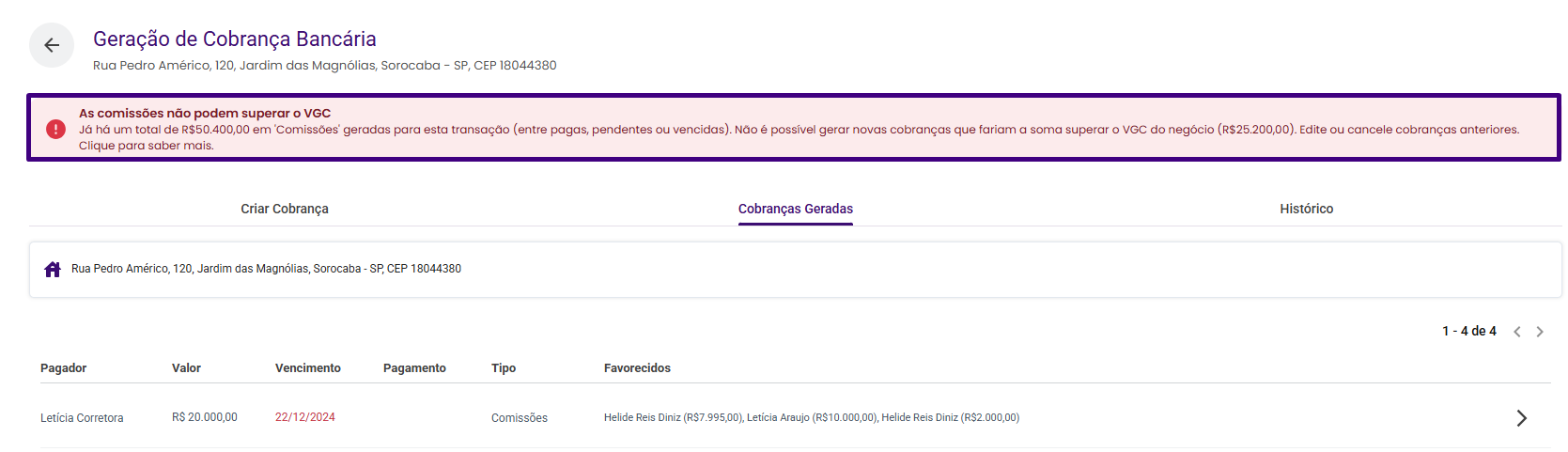 Para proteger corretores, imobiliárias e redes franqueadas contra erros operacionais e duplicidades, o Pipeimob impede a criação de cobranças de comissão que ultrapassem o VGC (Valor Geral da Comissão) da transação.