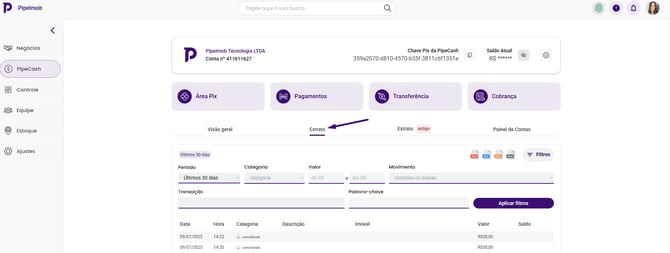 Menu lateral > PipeCash > Conta > Extrato