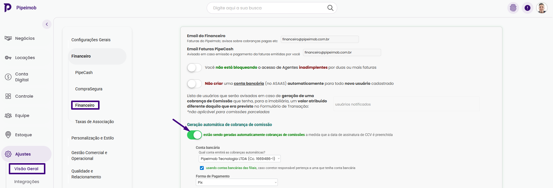 Para ativar acesse: Ajustes → Visão Geral → Financeiro