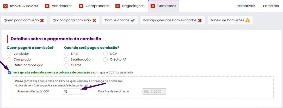 Como ativar a geração automática de cobrança de comissão após a assinatura do CCV