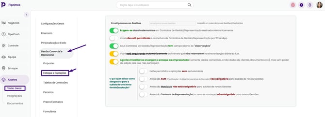 Acesse Ajustes > Visão Geral > Gestão Comercial e Operacional > Estoque e Captações.