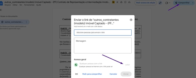 Diferente da assinatura por e-mail, o contrato não será personalizado com o nome ou dados do imóvel dentro do arquivo. Essas informações estarão apenas na mensagem enviada.