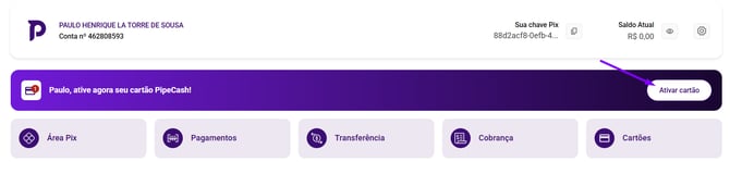 No topo da tela, localize o banner roxo: "Ative agora seu cartão PipeCash!".