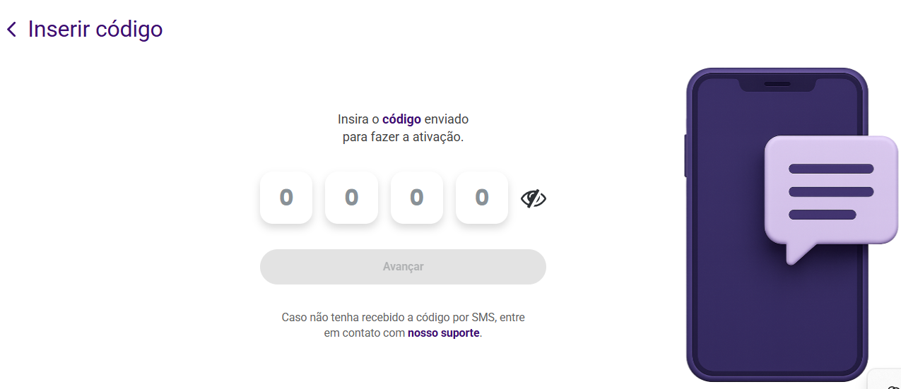 Caso tenha qualquer problema com o recebimento do SMS ou erro na validação dos dados, entre em contato com nosso suporte através do chat.