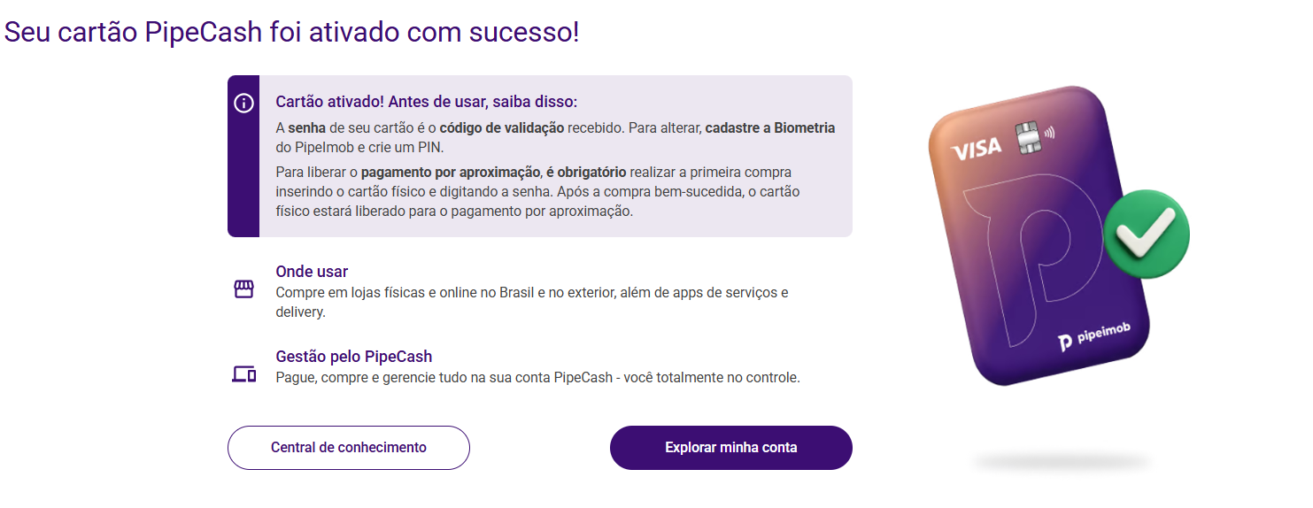 Pronto! Você verá a confirmação: "Seu cartão PipeCash foi ativado com sucesso!".