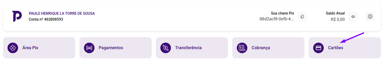 O Cartão físico é identificado pelo ícone de cartão e o nome do titular.