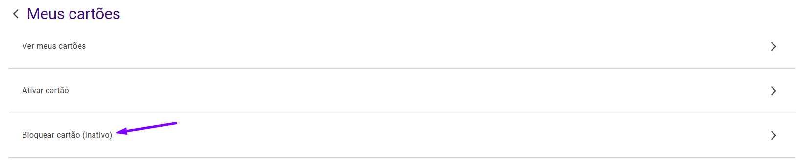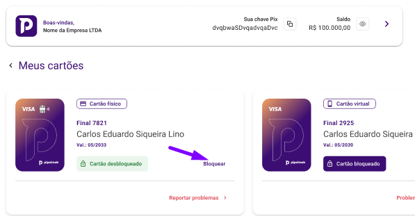 O status do cartão mudará para a cor roxa com a mensagem Cartão bloqueado, confirmando que ele está inativo para uso.