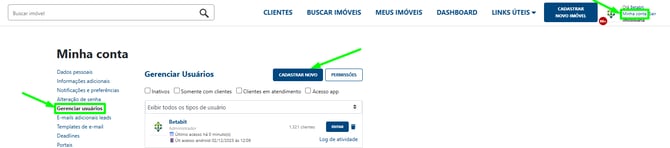 Acesse o Menu: Minha Conta > Gerenciar Usuários e clique no botão azul CADASTRAR NOVO.