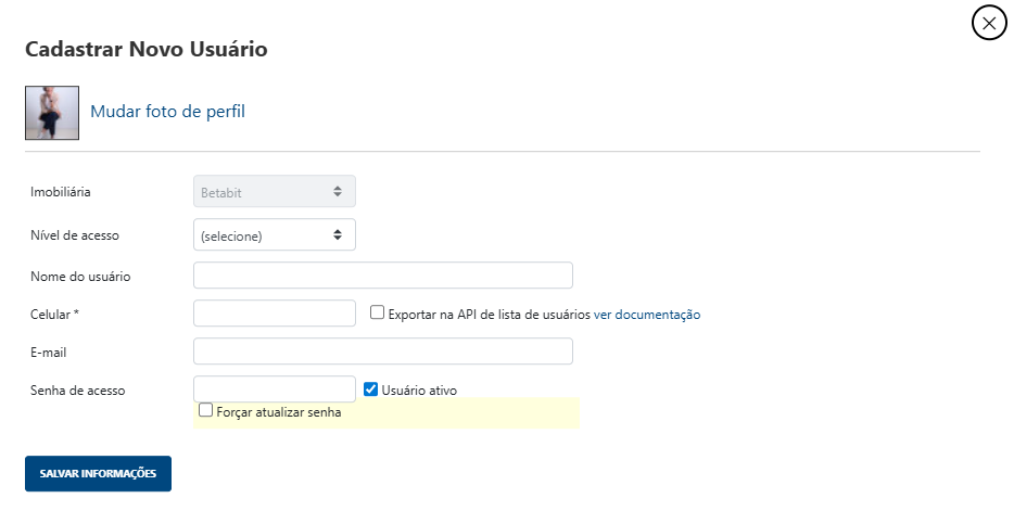 Nível de acesso: Escolha a permissão adequada (Administrador, Corretor, etc.).