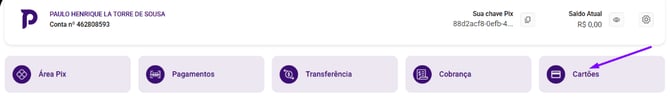 Na tela inicial da sua conta, localize o menu principal de transações. Clique no bloco Cartões para visualizar as opções de gerenciamento.