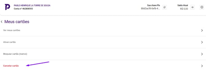 Aprenda a realizar o cancelamento definitivo do seu cartão físico ou virtual diretamente pela plataforma.