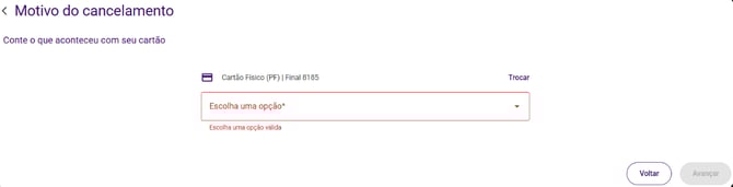💡 Fique atento: Cancelar um cartão é uma ação definitiva. Se você apenas perdeu o cartão de vista ou deseja impedir o uso temporariamente por segurança, utilize a opção Bloquear cartão.