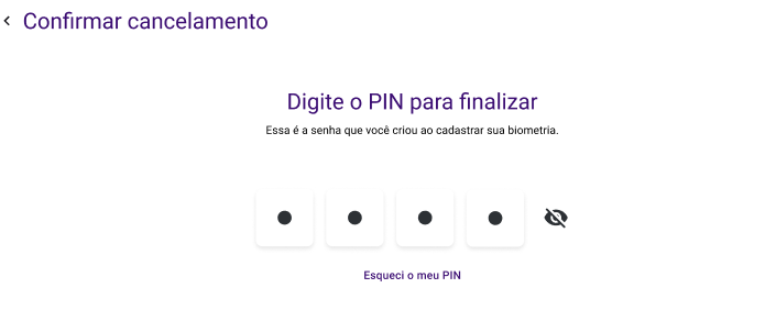 Digite o seu PIN de 4 dígitos (a mesma senha criada durante o cadastro da sua biometria) para validar o cancelamento.