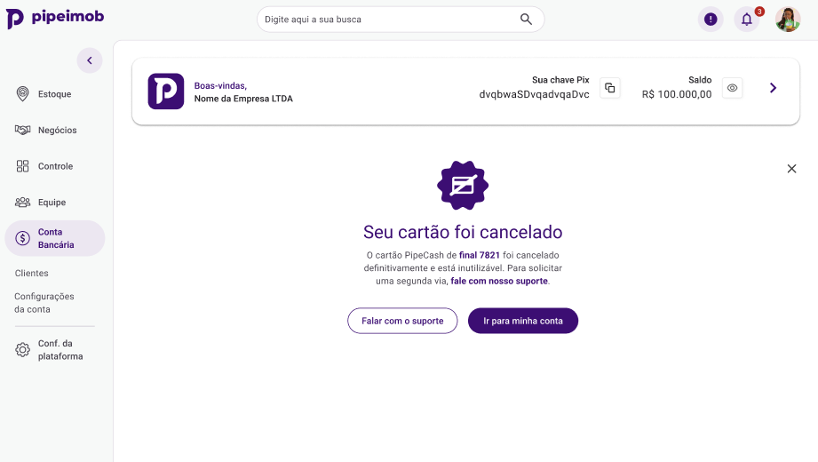 No PipeImob, você tem total autonomia para gerenciar seus cartões. Caso precise encerrar o uso de um cartão de forma definitiva, seja por perda, roubo ou decisão estratégica — o processo pode ser feito instantaneamente pelo painel, sem a necessidade de aguardar o horário comercial. O cancelamento interrompe qualquer transação na hora, garantindo a segurança do seu saldo.