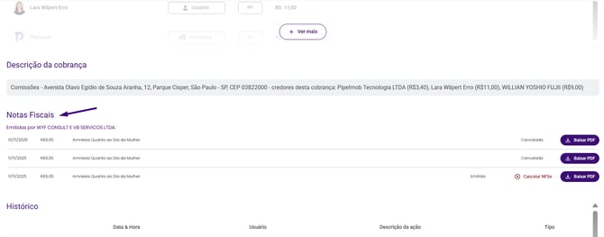 Role até a seção Notas Fiscais. Ali você vê todas as NFS-e emitidas para essa cobrança.