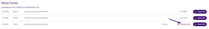 - Ao lado da nota, clique em Cancelar NFS-e.