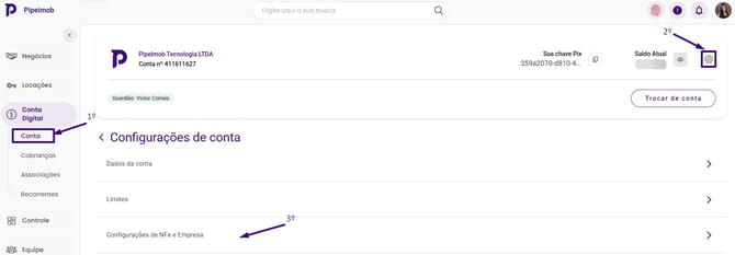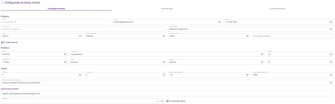 Esse cadastro é feito dentro do módulo Conta Digital > Conta > Configurações de NFe e Empresa.