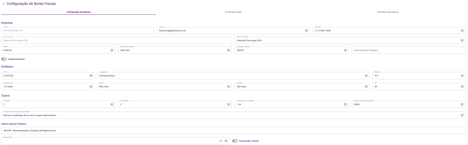 O primeiro passo para emitir Notas Fiscais pelo Pipeimob é realizar o cadastro da empresa emissora.