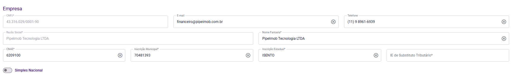 CNPJ, razão social e nome fantasia — geralmente já vêm preenchidos pelo sistema.