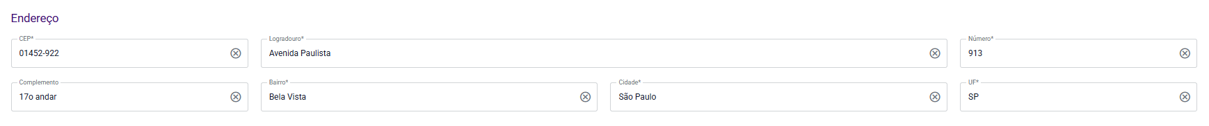 CEP; Logradouro (rua ou avenida), Número; Bairro; Cidade e UF.