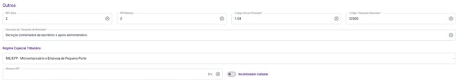 Código do serviço prestado e código de tributação municipal — ambos podem ser encontrados em notas fiscais anteriores ou confirmados pela contabilidade.