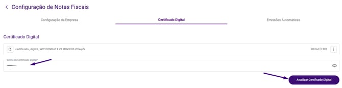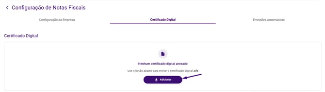 Depois de salvar o cadastro da empresa, é preciso anexar o certificado digital, utilizado para assinar eletronicamente as notas.