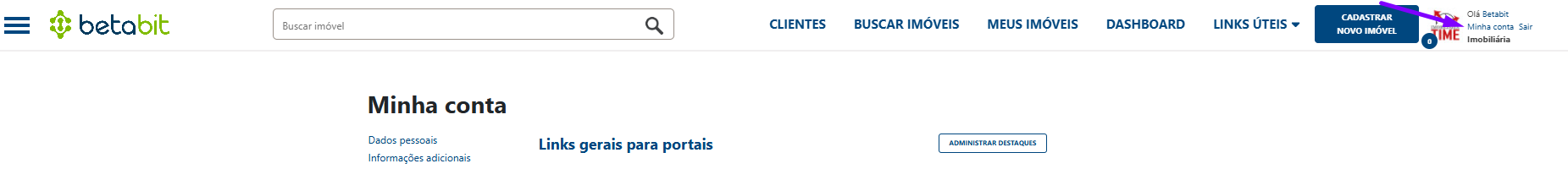 No menu superior, clique no ícone do usuário (ou nome da imobiliária) e selecione Minha Conta.