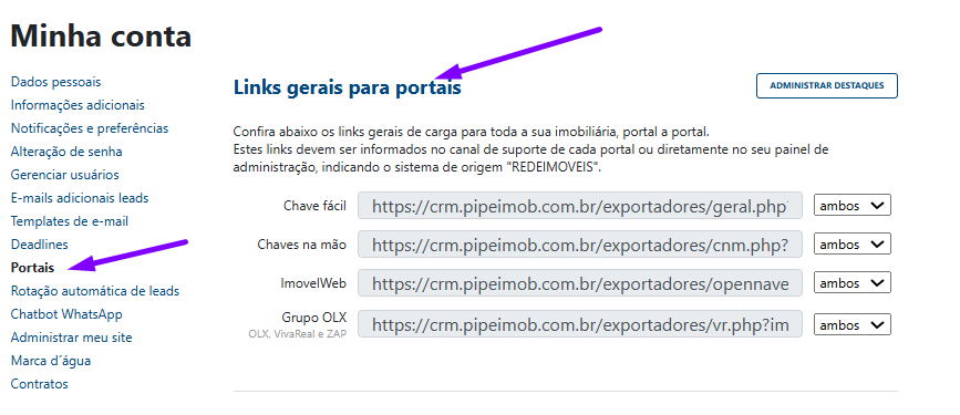 Copie o link correspondente ao portal desejado (ex: Chave Fácil, Chaves na Mão, ImovelWeb, Grupo OLX) e informe-o ao suporte do portal ou insira-o no painel de administração do próprio portal.