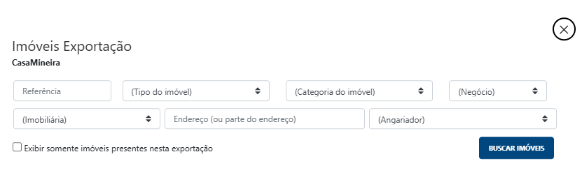 Uma janela chamada Imóveis Exportação será aberta. Nela, você pode filtrar os imóveis por: