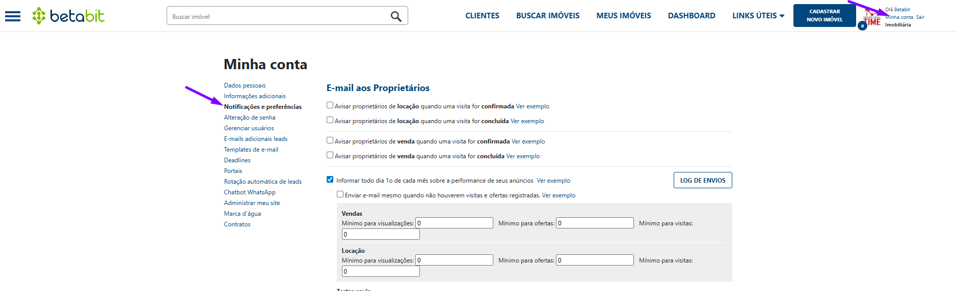 1. Acesse as configurações da sua conta No menu superior, clique no seu nome de usuário (ou nome da imobiliária) e selecione a opção Minha Conta. No menu lateral esquerdo, clique em Notificações e preferências.