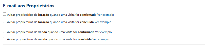 2. Configure os avisos de visitas Na seção "E-mail aos Proprietários", você encontrará opções específicas para locação e venda:
