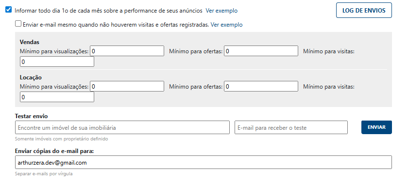 Dica: Se desejar que o proprietário receba o relatório mesmo que o imóvel não tenha tido movimento no mês, marque a caixa "Enviar e-mail mesmo quando não houverem visitas e ofertas registradas".