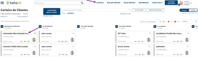No menu superior do CRM, clique na opção "CLIENTES". Localize o cliente desejado na listagem e dê um duplo clique sobre o nome dele para abrir a ficha de edição.