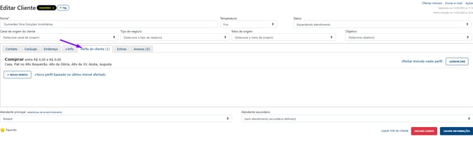Dentro da ficha do cliente, procure pela aba "Perfis do cliente". É aqui que o sistema entende o que o cliente busca (ex: tipo de imóvel, dormitórios, valor e localização).