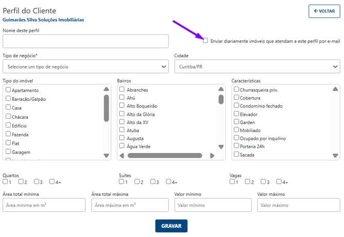 ⚠️ Importante: Para que o e-mail automático funcione, o cliente precisa ter pelo menos um perfil de busca cadastrado e configurado.