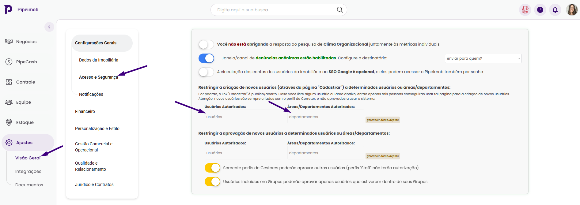 No PipeImob, é possível configurar quais usuários ou departamentos terão permissão para aprovar novos cadastros. Essa definição garante maior segurança e controle sobre quem acessa os dados da imobiliária.