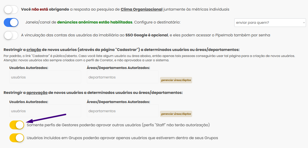 Para limitar a aprovação apenas a usuários que pertencem ao mesmo grupo, basta ativar a chave de configuração correspondente.