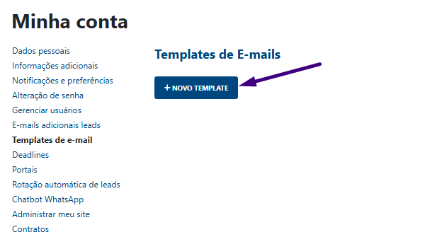 3. Inicie a criação No painel central, clique no botão azul "+ NOVO TEMPLATE". Uma janela de edição será aberta.