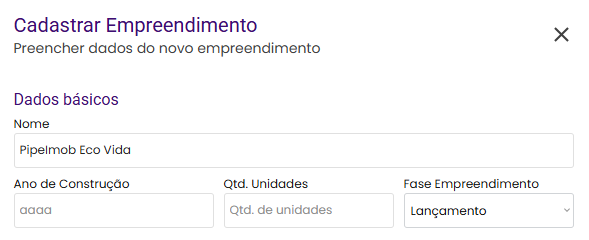 Nome do empreendimento, Ano de construção (opcional), Quantidade de unidades (opcional), Fase do empreendimento (ex: Lançamento, Pronto, Em obras)