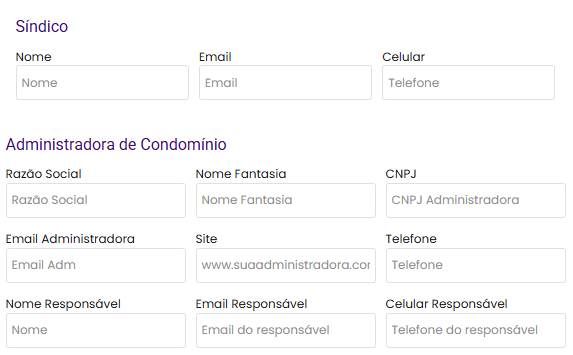 Esses campos não são obrigatórios, mas podem ser úteis caso sua imobiliária mantenha contato direto com a administração do condomínio.