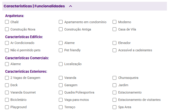 Na seção Características | Funcionalidades, você pode marcar atributos como: